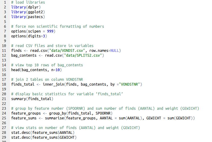 to sum the number of finds (AANTAL) and weight (GEWICHT) in the grouped table, giving us the weight and number of finds per feature (saved in variable feature_sums). In your Environment tab, view feature_sums in table view to see what the data looks like.